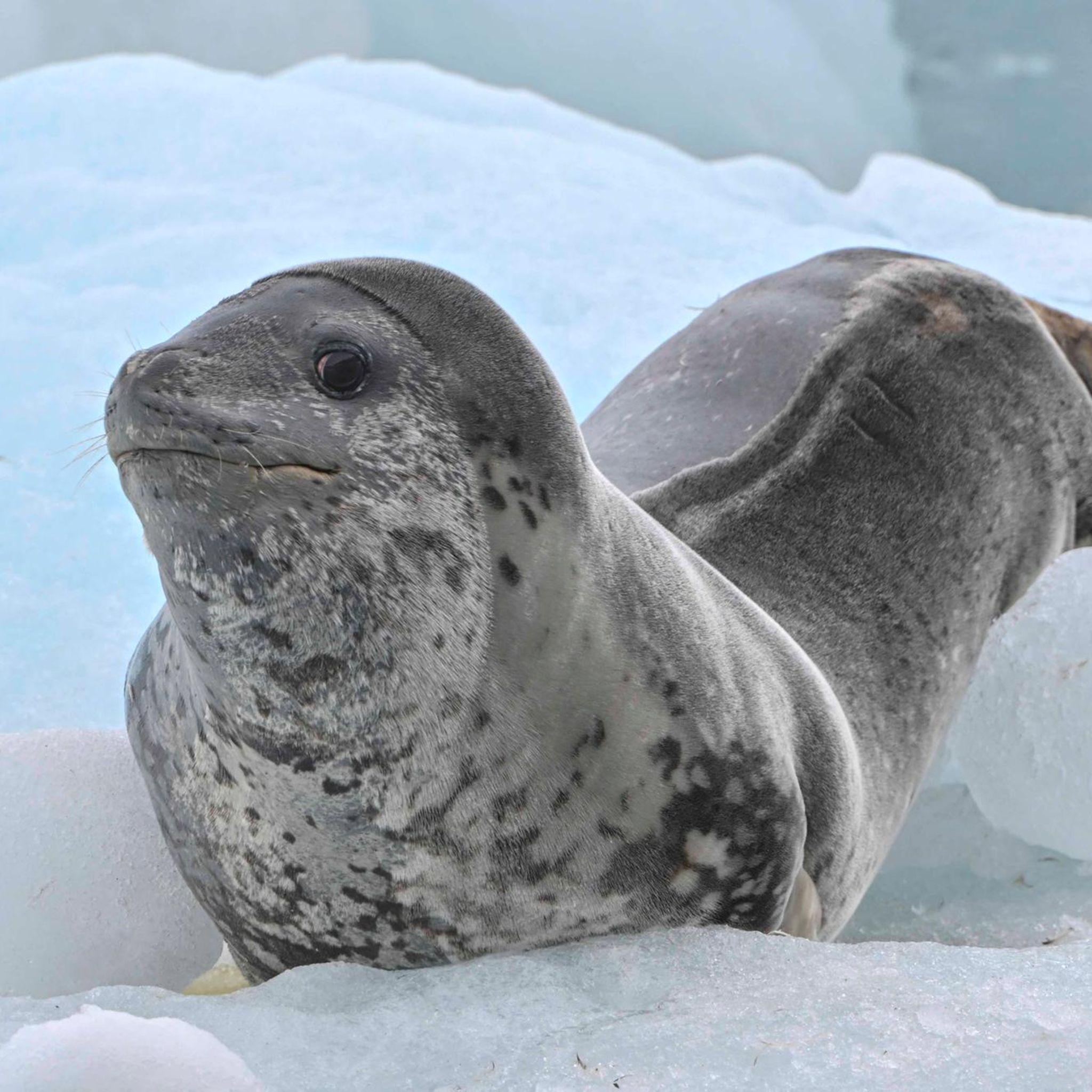 Livingston Island, Antarktis. Ein Seeleopard (Hydrurga leptonyx) ist auf den Südshetlandinseln im Eis unterwegs und scheint sich seines Lebens zu freuen.