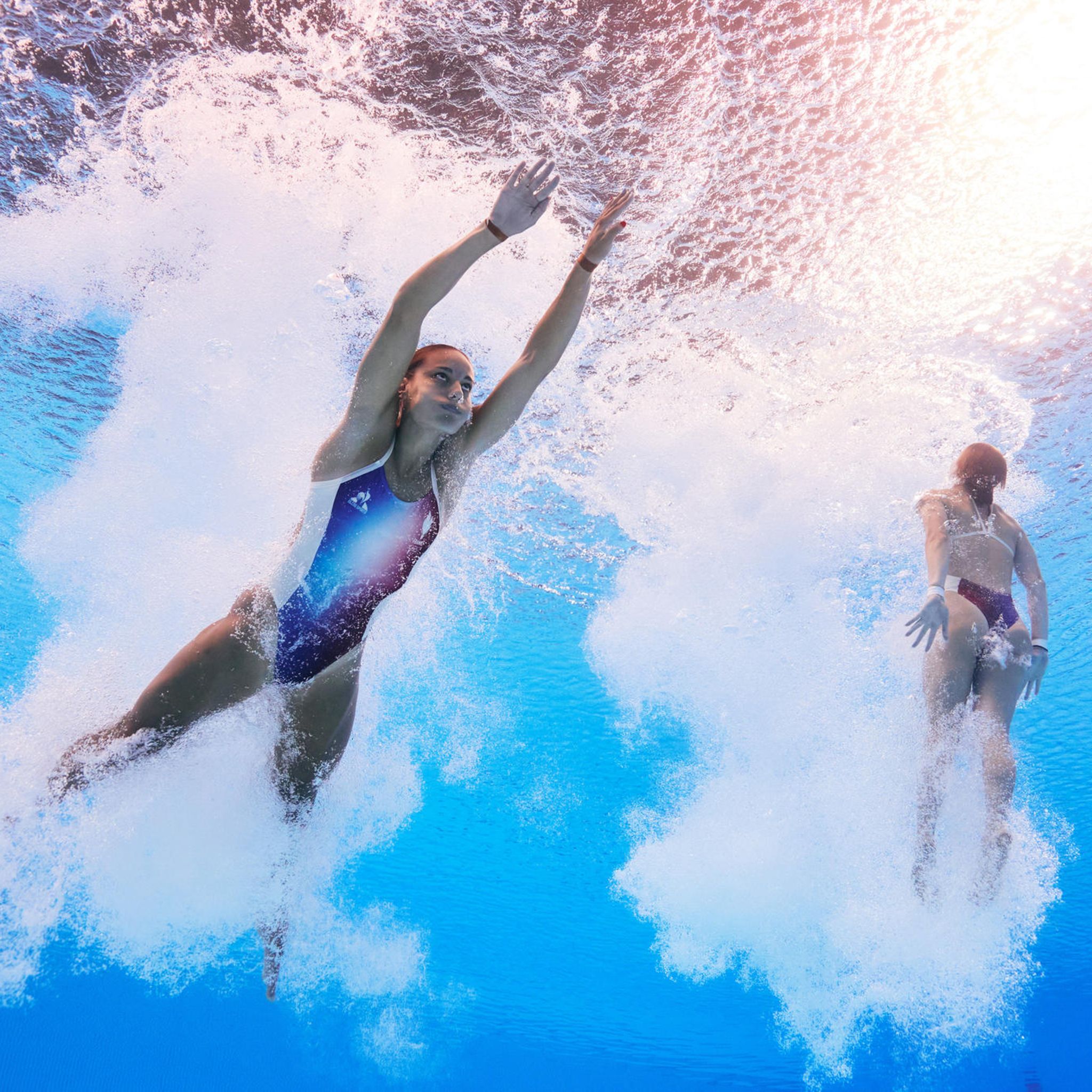 Paris, Frankreich. Eingetaucht in eine Schaumwolke aus Luftbläschen sind die beiden französischen Synchronspringerinnen Naïs Gillet and Juliette Landi nach ihrem Sprung vom Drei-Meter-Brett
