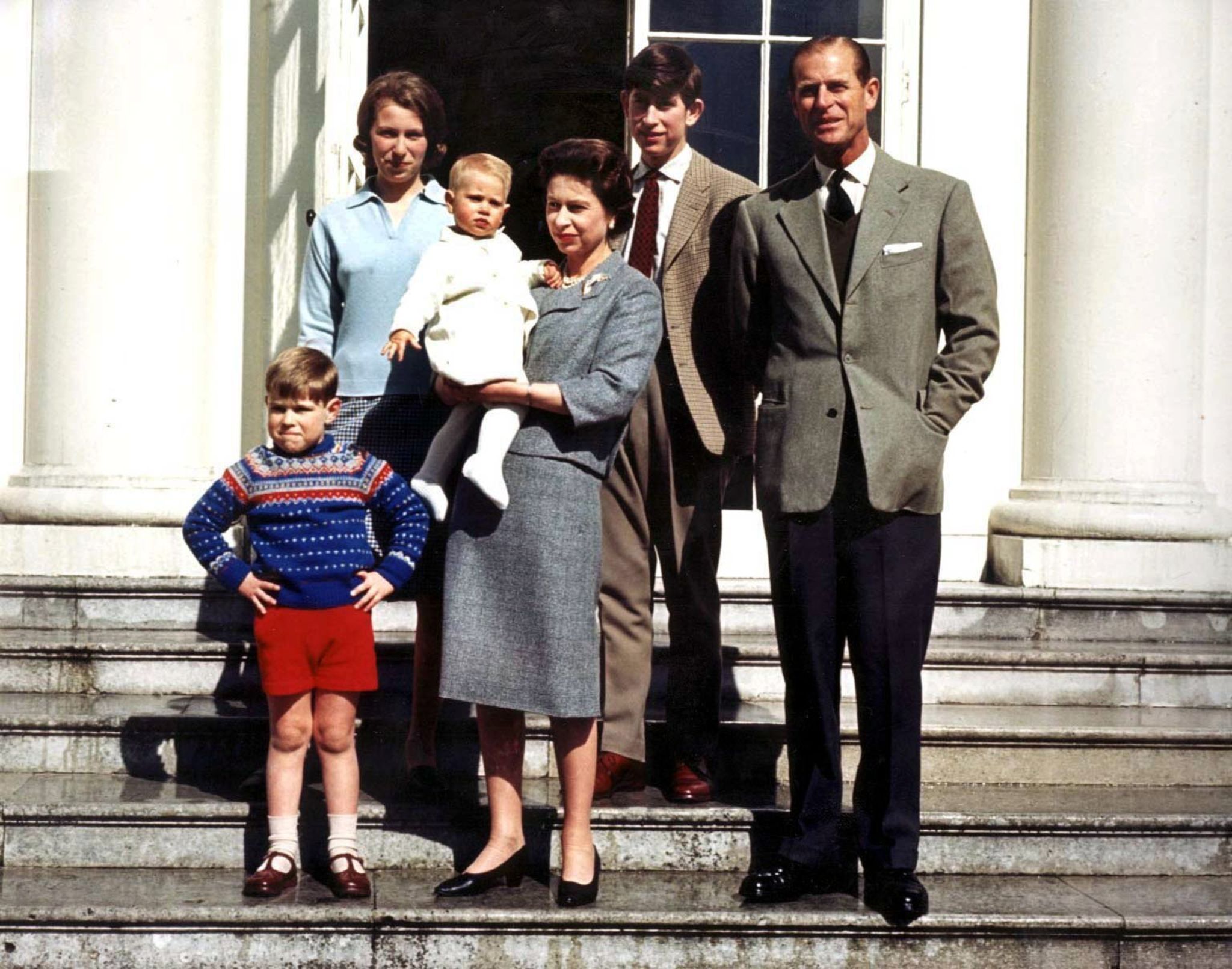 1964 bekamen die Queen und Prinz Philip einen weiteren Sohn, Edward. Während Prinz Charles schon früh auf die Rolle des Thronfolgers vorbereitet wurde, genoss sein zwölf Jahre jüngerer Bruder Andrew mehr Freiheiten. Bei diesem Familienporträt aus dem Jahr 1965 schneidet der Fünfjährige Grimassen.