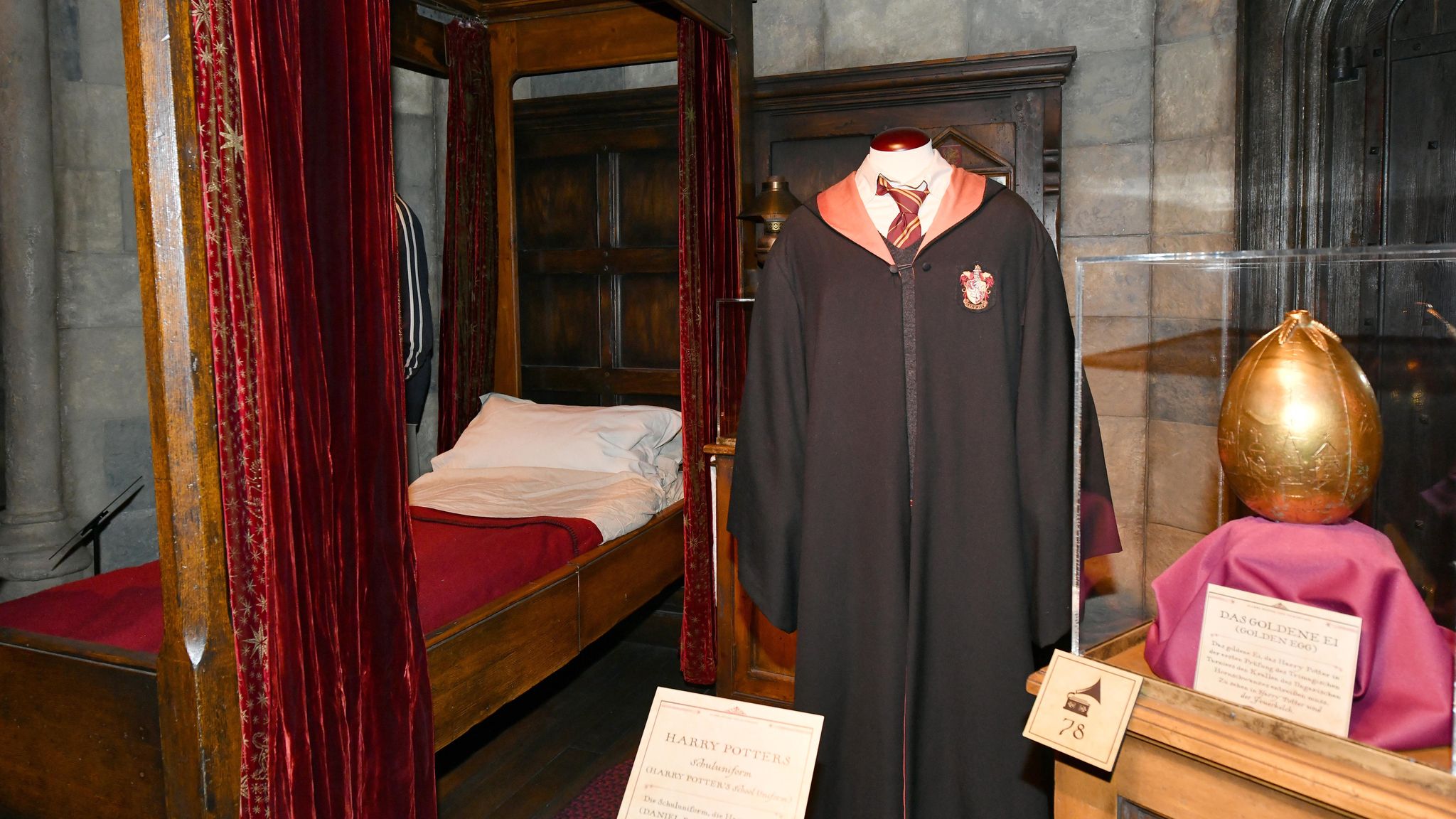 Harrys Umhang neben seinem Gryffindor-Bett und dem goldenen Ei aus "Harry Potter und der Feuerkelch"