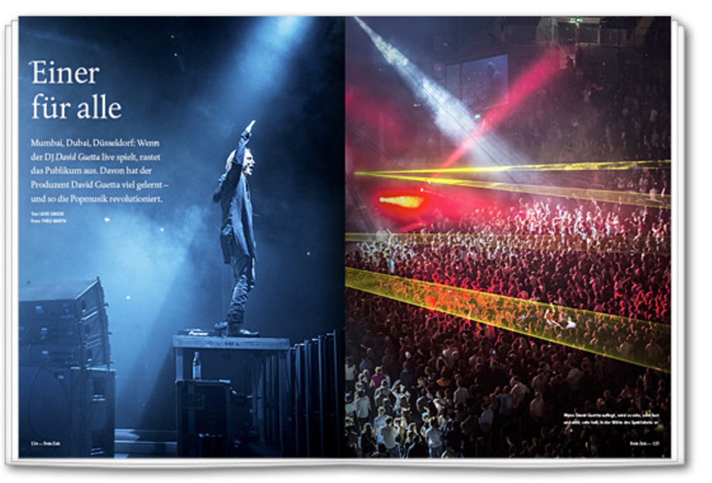 Vielleicht wirkt er deshalb manchmal noch überrascht, wenn er heute in die Masse vor sich blickt: Im Gegensatz zu jüngeren DJs wie Avicii oder Deadmau5 weiß er noch, wie es war, als DJs keine Stars waren, sondern eben die Typen, die die Platten anschleppen. Im Pariser Club »Le Palace« war Guetta im Keller untergebracht. Ob seine Musik ankam, konnte er durch ein Loch in der Wand erahnen, durch das er nur die Füße der Gäste sah. Im »Les Bains Douches« standen seine Turntables in einem anderen Raum als die Tanzfläche. Um zu sehen, ob jemand tanzte, musste Guetta jedes Mal zur Tanzfläche laufen. Guetta lacht, als er vor seinem Auftritt in seinem Hotelzimmer davon erzählt. Einen lebensverändernden Moment habe er dann 1988 im Londoner Club »Shoom« erlebt. »Da stand der DJ auf der Bühne, Licht auf ihm und spielte House. So etwas hatte ich noch nie erlebt.« Am nächsten Tag gab Guetta sein gesamtes Geld für Houseplatten aus, fuhr zurück nach Paris und startete die erste Housepartyreihe in der Stadt. Auch bei den Partys, die er später für verschiedene Pariser Clubs organisierte: war der DJ immer zu sehen. Das Interesse daran sei immer mehr gewachsen, weil er seine Lieblings- DJs aus den USA eingeladen habe, »die sahen anders aus, kannten andere Tricks, das wollte man sehen«, sagt Guetta. Dann begannen er und andere DJs, selbst Musik zu produzieren. »Und die Welt sah den DJ plötzlich nicht mehr nur als Musikaufleger, sondern als Künstler.« Der DJ rückte endgültig ins Zentrum der Clubs. Und von da an, sagt Guetta, sei eben alles immer größer geworden.