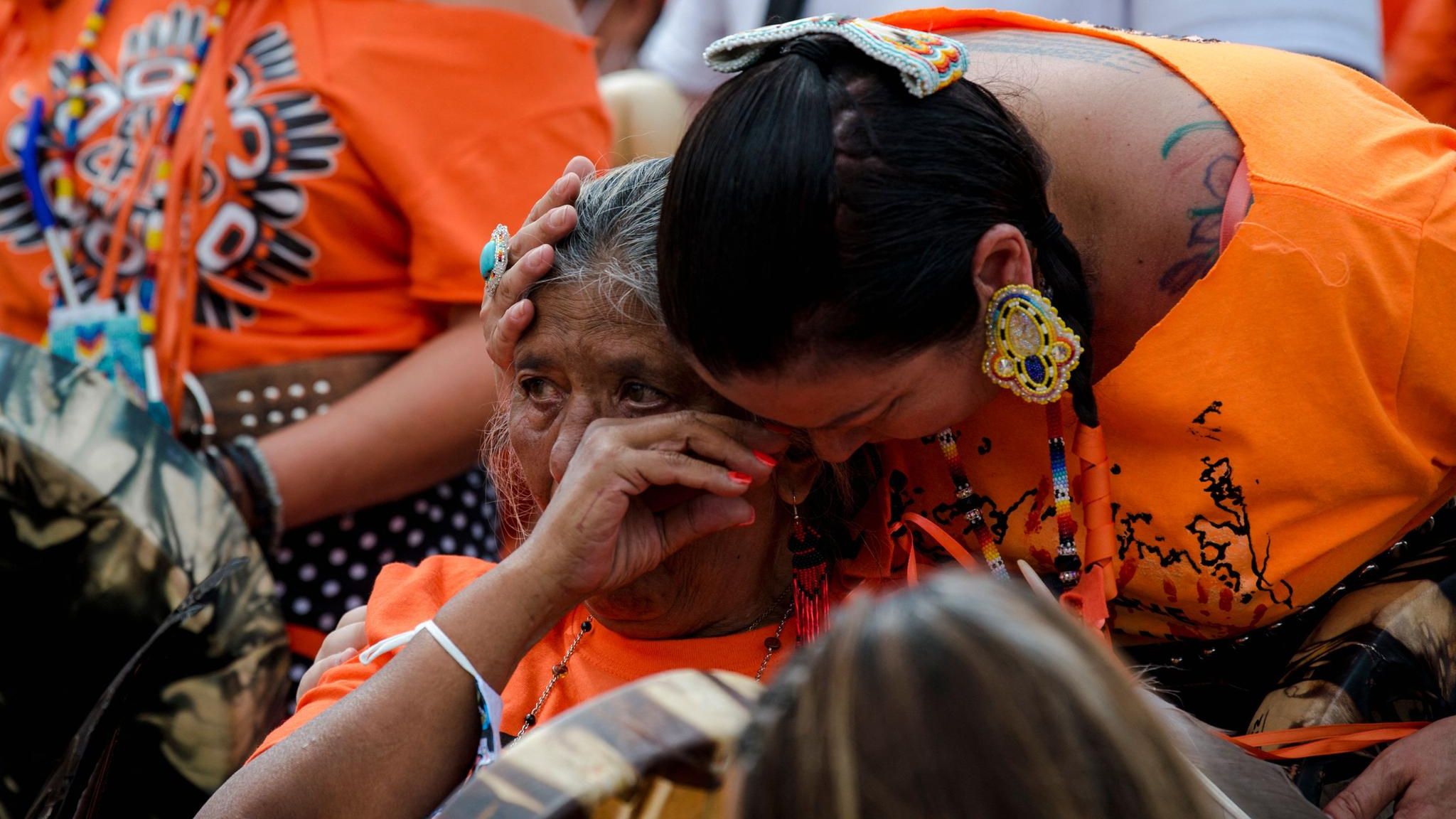 Die Trauer ist aktuell und real – indigene Frau am Mont Royal in Montréal.