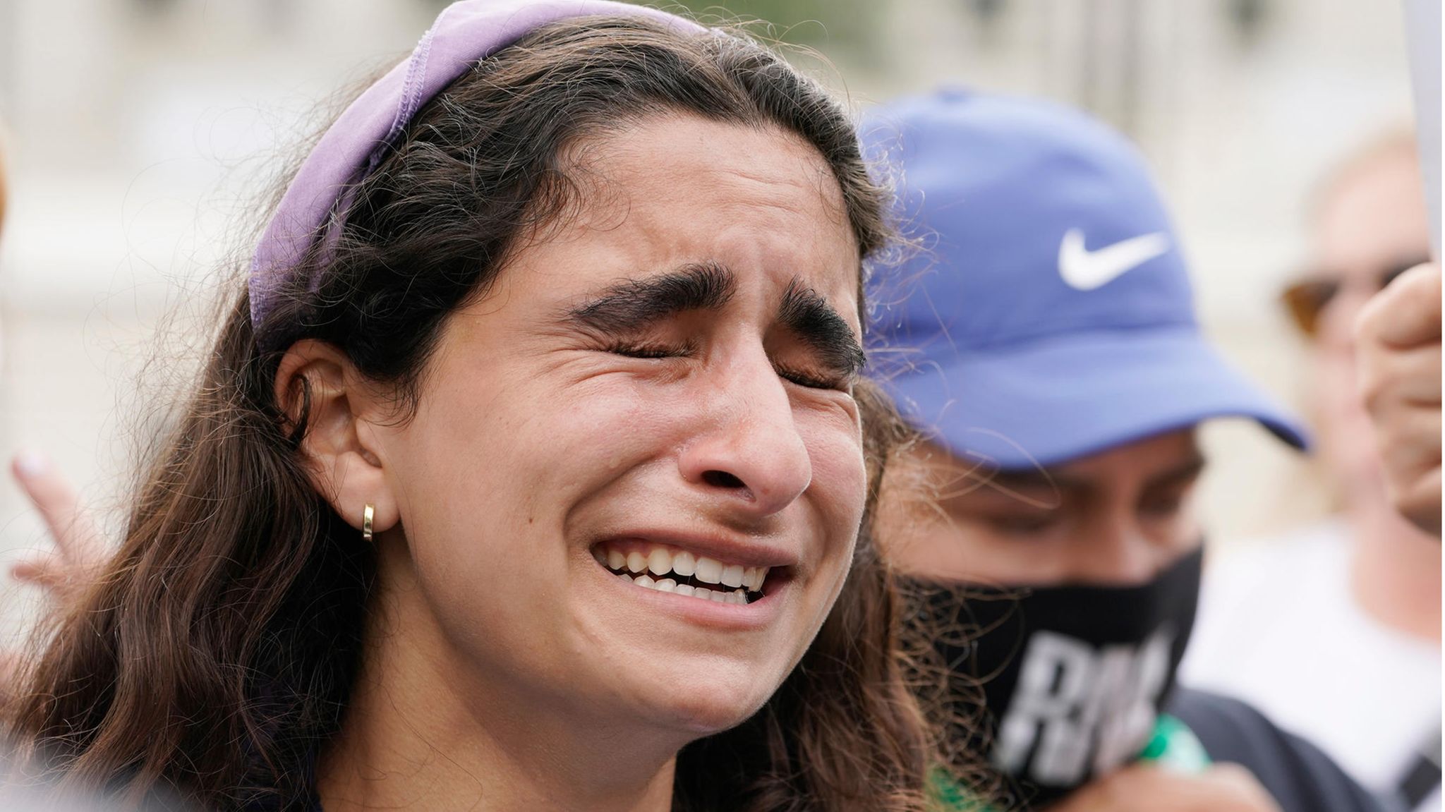 Als das Urteil kommt, brechen viele Menschen in Tränen aus – manche vor Freude. Und manche aus Trauer, so wie diese Frau, die weinend vor Frustration und Wut vor dem Gebäude des Obersten Gerichtshofs der USA steht, als klar wird, dass das Abtreibungsrecht gekippt wurde.