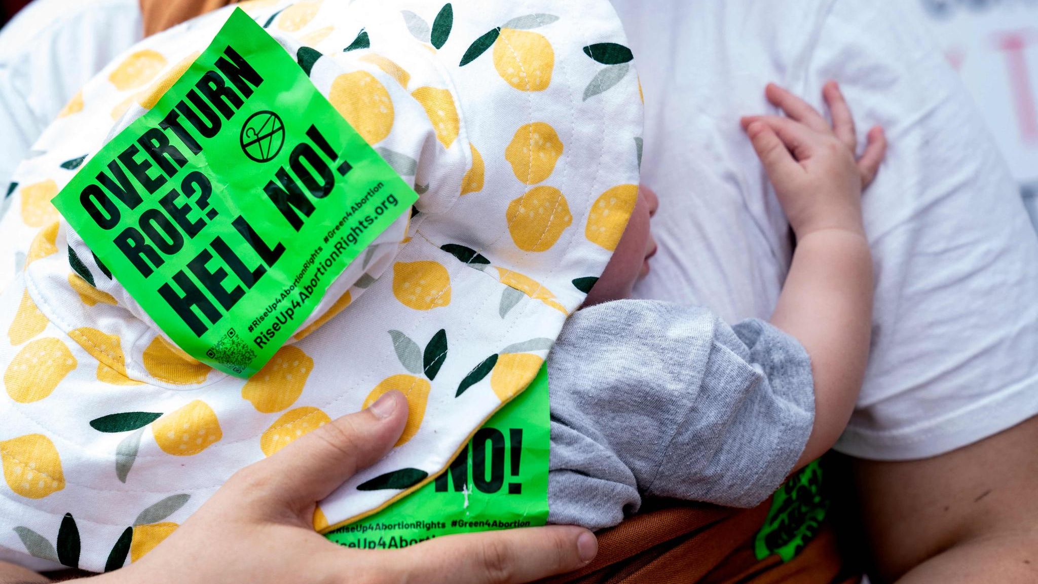"Roe überstimmen? Zur Hölle, nein!", steht auf einem Sticker, der einem Baby auf den Sonenhut geklebt wurde. Ja, auch ganz Kleine waren bei der Demonstration dabei.