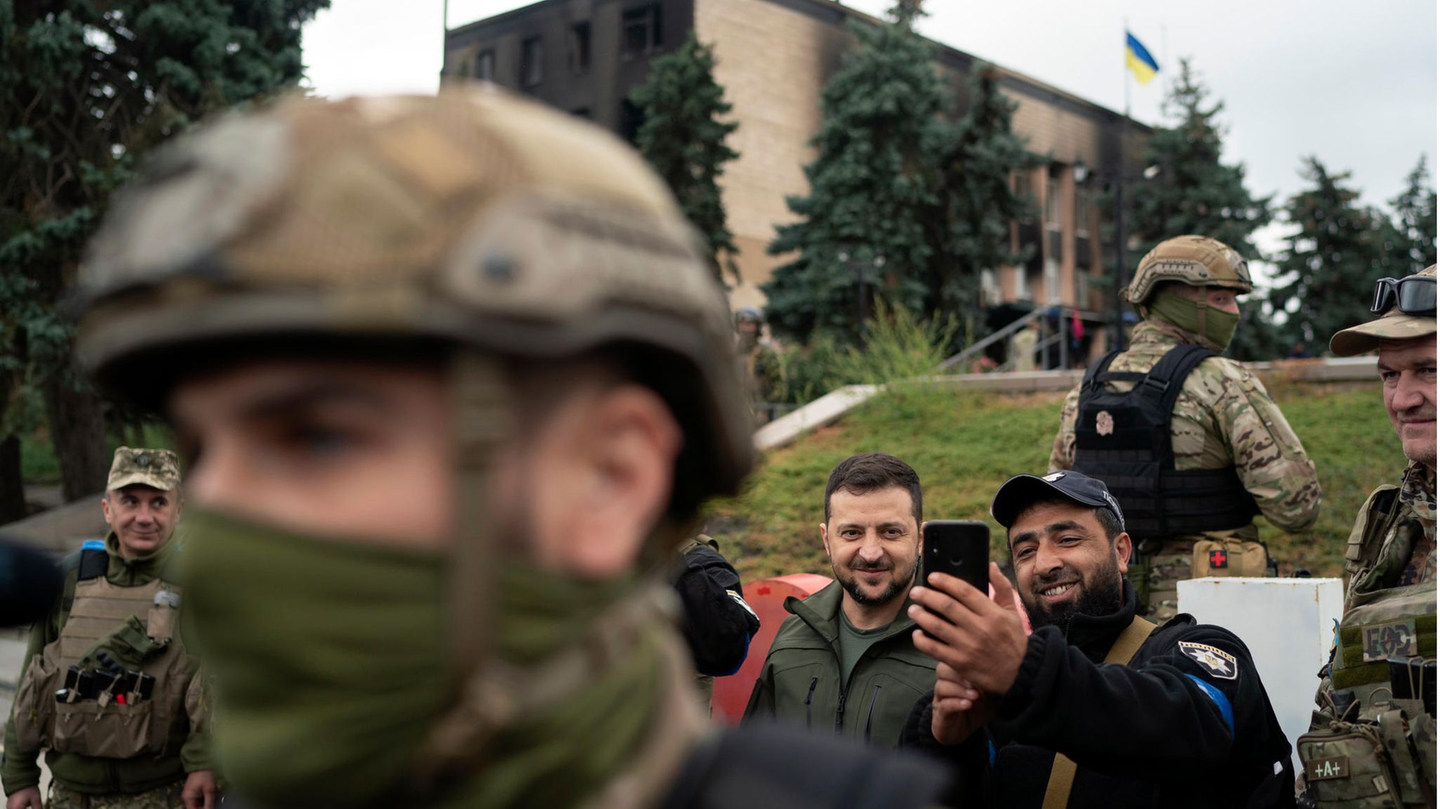 Selfie mit Selenskyj: In Isjum hat der ukrainische Präsident (M.) Soldaten und Polizisten besucht.