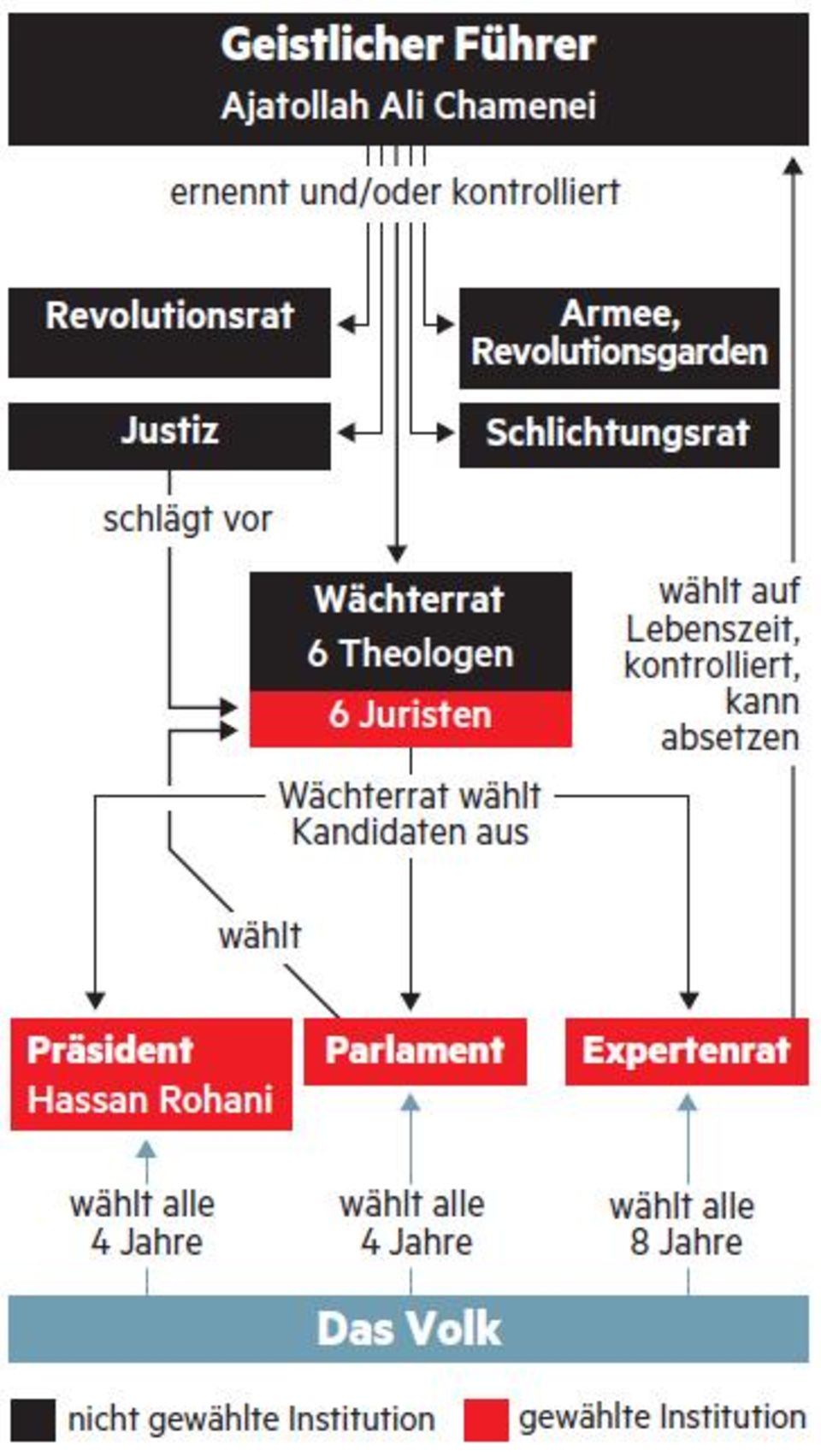 Fast 60 Millionen Bürger sind zu der Wahl aufgerufen. Wirklich bestimmen, was für eine Politik in der islamischen Republik gemacht wird, können sie aber nicht. Denn die Geschicke des Landes werden nicht vom Volk gelenkt, sondern von einem einzigartigen, komplexen politischen System, das Elemente einer modernen islamischen Theokratie mit denen einer Demokratie kombiniert. Ein Netzwerk nicht gewählter Institutionen, die vom geistliche Oberhaupt kontrolliert werden, agiert neben einem vom Volk gewählten Präsidenten und Parlament.