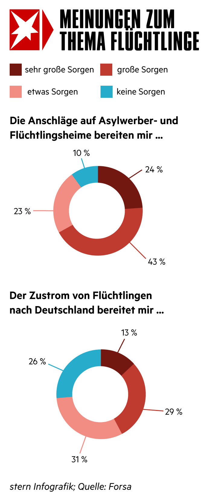 Die Zunahme der Brandanschläge auf Asylbewerber- und Flüchtlingsunterkünfte bereitet einer Mehrheit von 67 Prozent der Bundesbürger große oder sehr große Sorgen. 33 Prozent machen sich nach einer Forsa-Umfrage für das Hamburger Magazin stern deswegen nur etwas (23 Prozent) oder gar keine (10 Prozent) Sorgen. Dies gilt insbesondere für die Anhänger der AfD, von denen 39 Prozent angeben, wegen der Anschläge überhaupt keine Sorgen zu haben – weit mehr als in allen anderen befragten Gruppen. Sehr große oder große Sorgen äußern vor allem die Anhänger der Linken (85 Prozent), der Grünen (78 Prozent) und der SPD (77 Prozent).