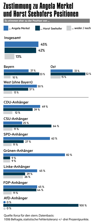 In einer repräsentativen Forsa-Umfrage im Auftrag von stern und RTL zu den Positionen von Angela Merkel und Horst Seehofer in der Flüchtlingspolitik teilen 45 Prozent der wahlberechtigten Bundesbürger die Haltung der Kanzlerin und 42 Prozent die Position des bayerischen Ministerpräsidenten. Forsa-Chef Güllner: "Dabei zeigen sich deutliche Unterschiede zwischen den Bewohnern des Freistaates Bayern und Ostdeutschlands und den Bürgern im Rest der Republik."