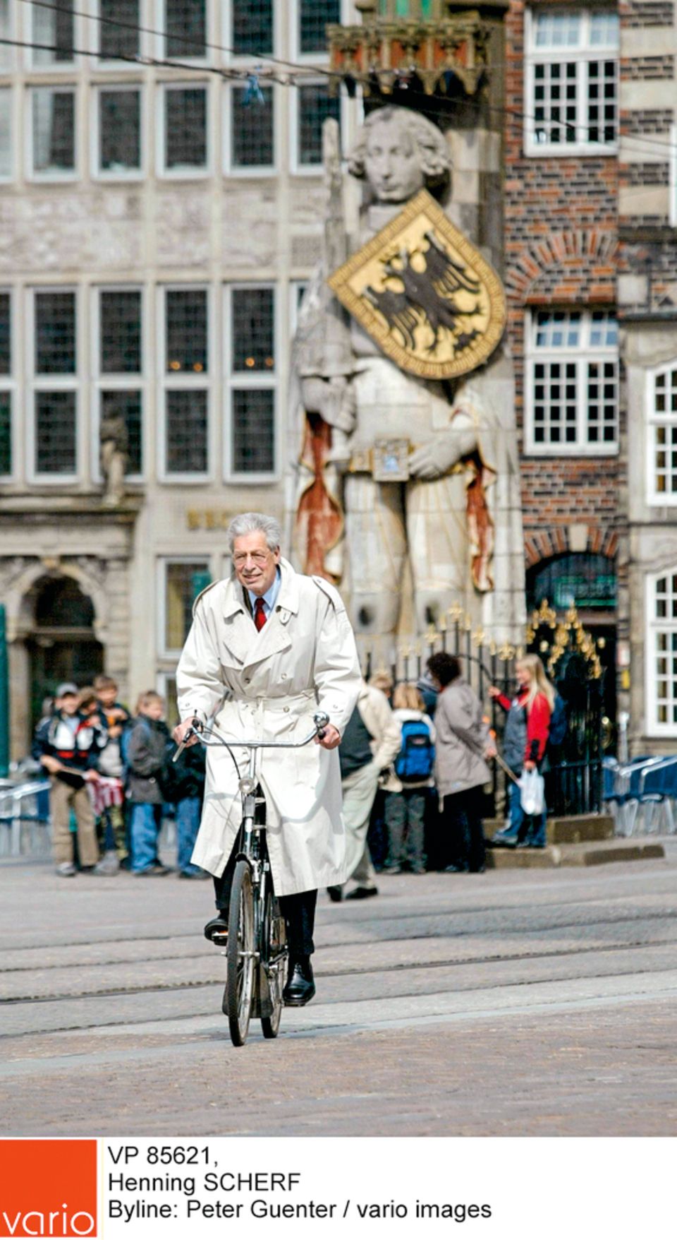Henning Scherf wurde 1938 in Bremen geboren. Der studierte Jurist gehörte ab 1971 der Bremischen Bürgerschaft an und wurde 1978 Senator. Von 1995 bis 2005 war er Bürgermeister des Stadtstaates. Nicht zuletzt durch seinen unkonventionellen Stil – so fuhr er etwa ohne Polizeischutz mit dem Rad durch die Bremer Innenstadt (Foto: 2004) – wurde er bundesweit bekannt. Scherf hat mehrere Bücher über das Älterwerden geschrieben. Der Vater von drei Kindern ist mit der Musikpädagogin Luise Scherf verheiratet.