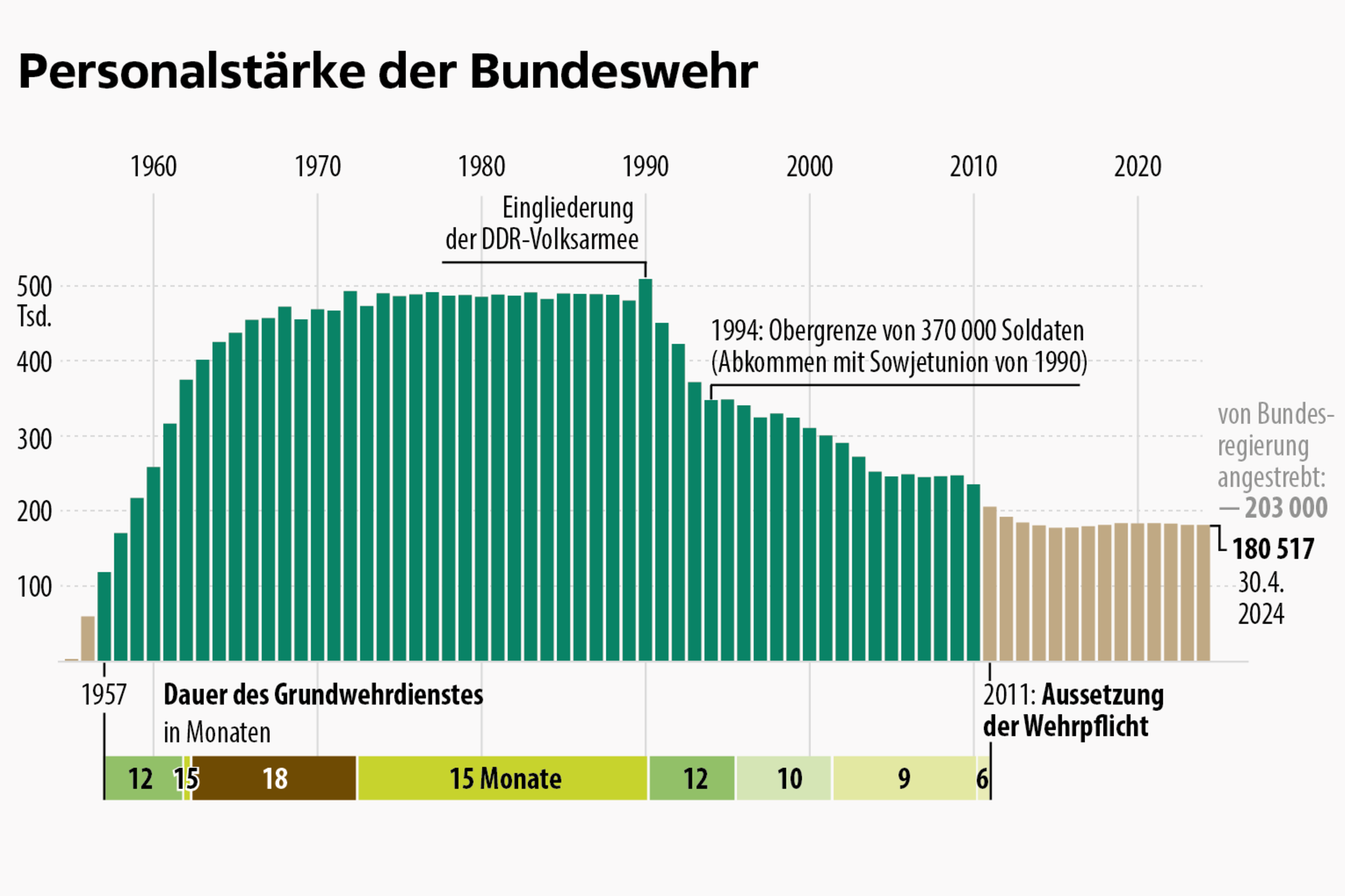 Bis 2031 will die Bundeswehr auf 203.000 Soldaten zu wachsen. Doch von diesem Ziel ist sie sie weit entfernt. Mit 180.517 Soldaten ist die Truppenstärke auf dem niedrigsten Stand seit 2018. Und das hat vor allem einen Grund: Die Bundeswehr hat ein Nachwuchsproblem. Die Zahl der Bewerbungen ist seit Jahren rückläufig, gleichzeitig ist die Zahl der Abgänger zuletzt gestiegen. Dazu kommt, dass auch die Zahl der Reservisten seit Aussetzung der Wehrpflicht 2011 stark gesunken ist. Derzeit gibt es laut Pistorius noch 60.000 Reservisten. "Wir brauchen rund 200.000 Reservisten mehr."