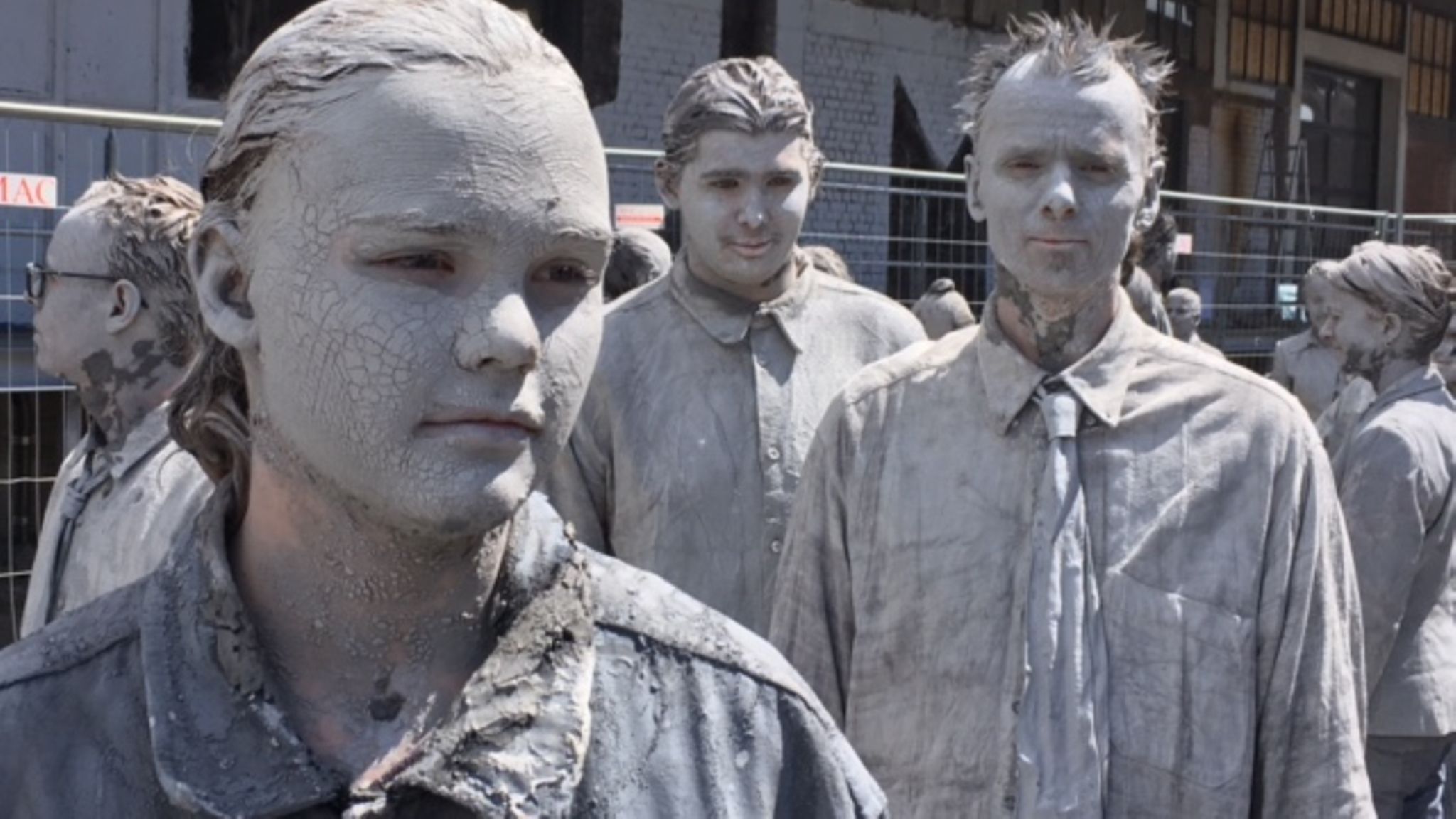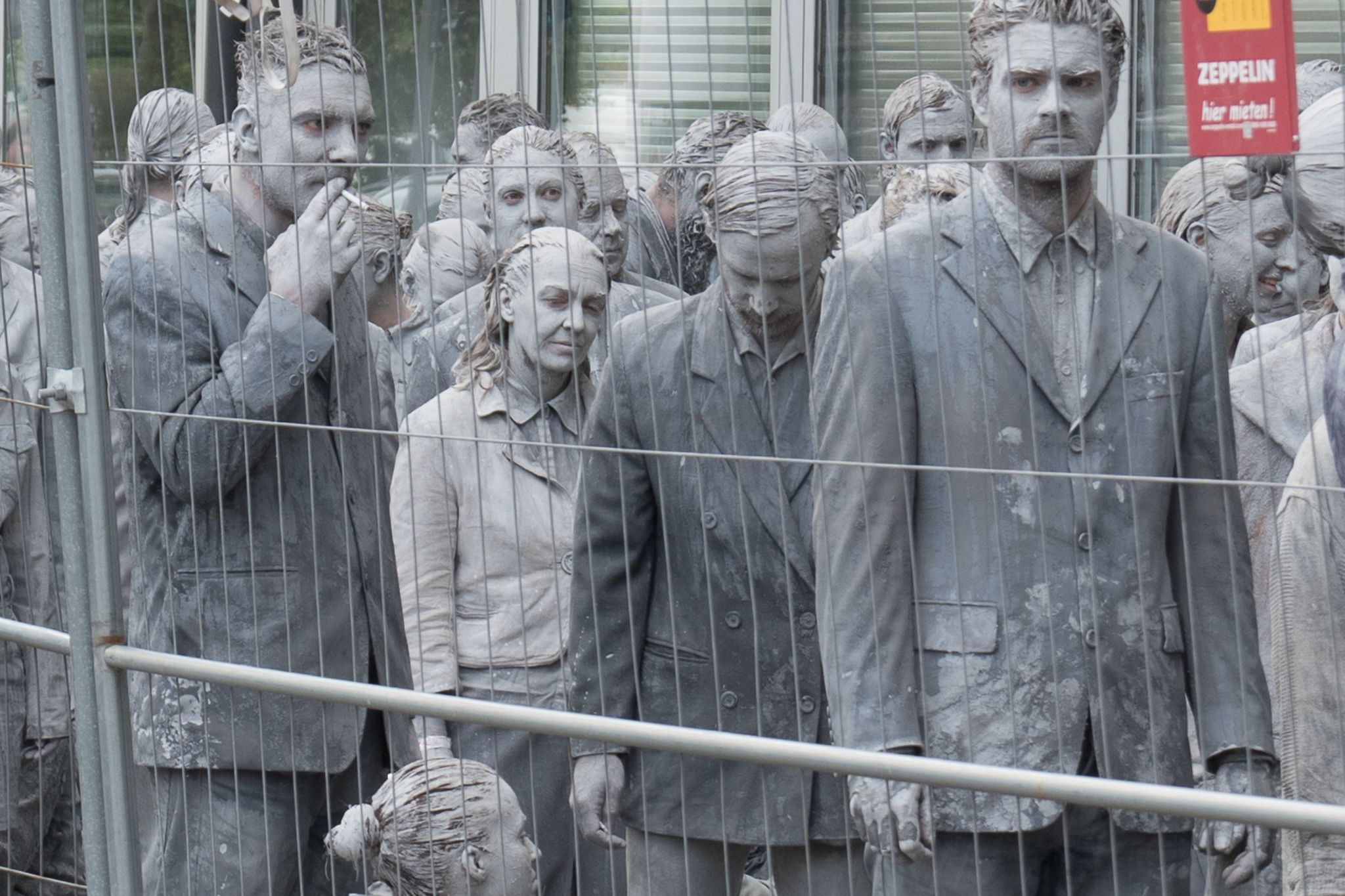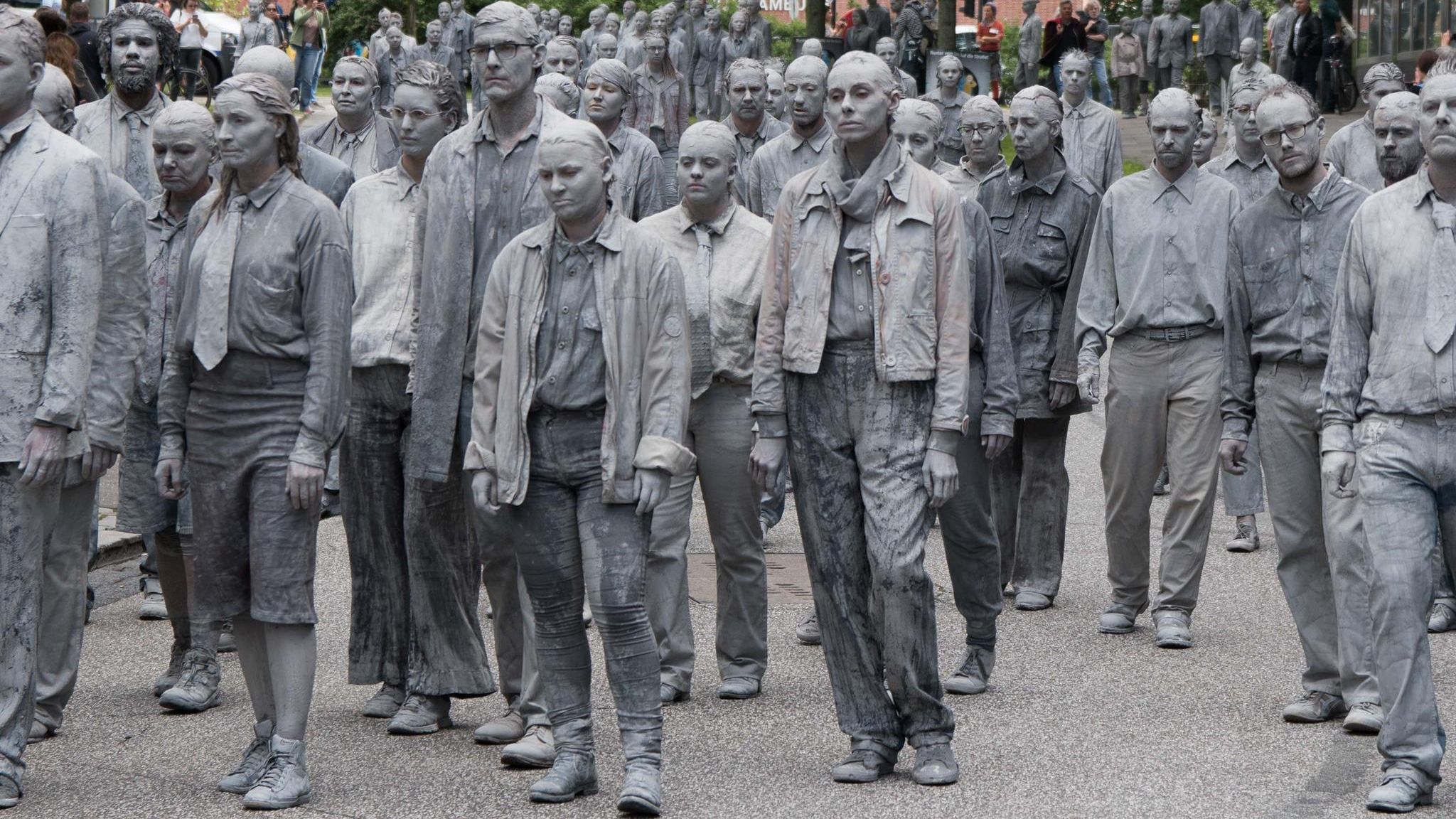 Wer die Gestalten zum ersten Mal sieht, muss auf Anhieb an die grauen Herren aus Michael Endes "Momo" denken. "Es gibt verschiedene Inspirationsquellen, die wir verwendet haben, aber tatsächlich gibt es eine starke Anlehnung an die grauen Herren", sagt Kohel. "Der Ton symbolisiert verkrustete Strukturen, verhärtete Gefühle und das Abgeschnitten-Sein von den eigenen Sinnen, man sieht und hört nicht richtig." Bei ihrer Performance, die in der Mittagszeit im Hamburger Kontorhausviertel stattfindet, werden die Akteure wie Zombies nebeneinander herschleichen.