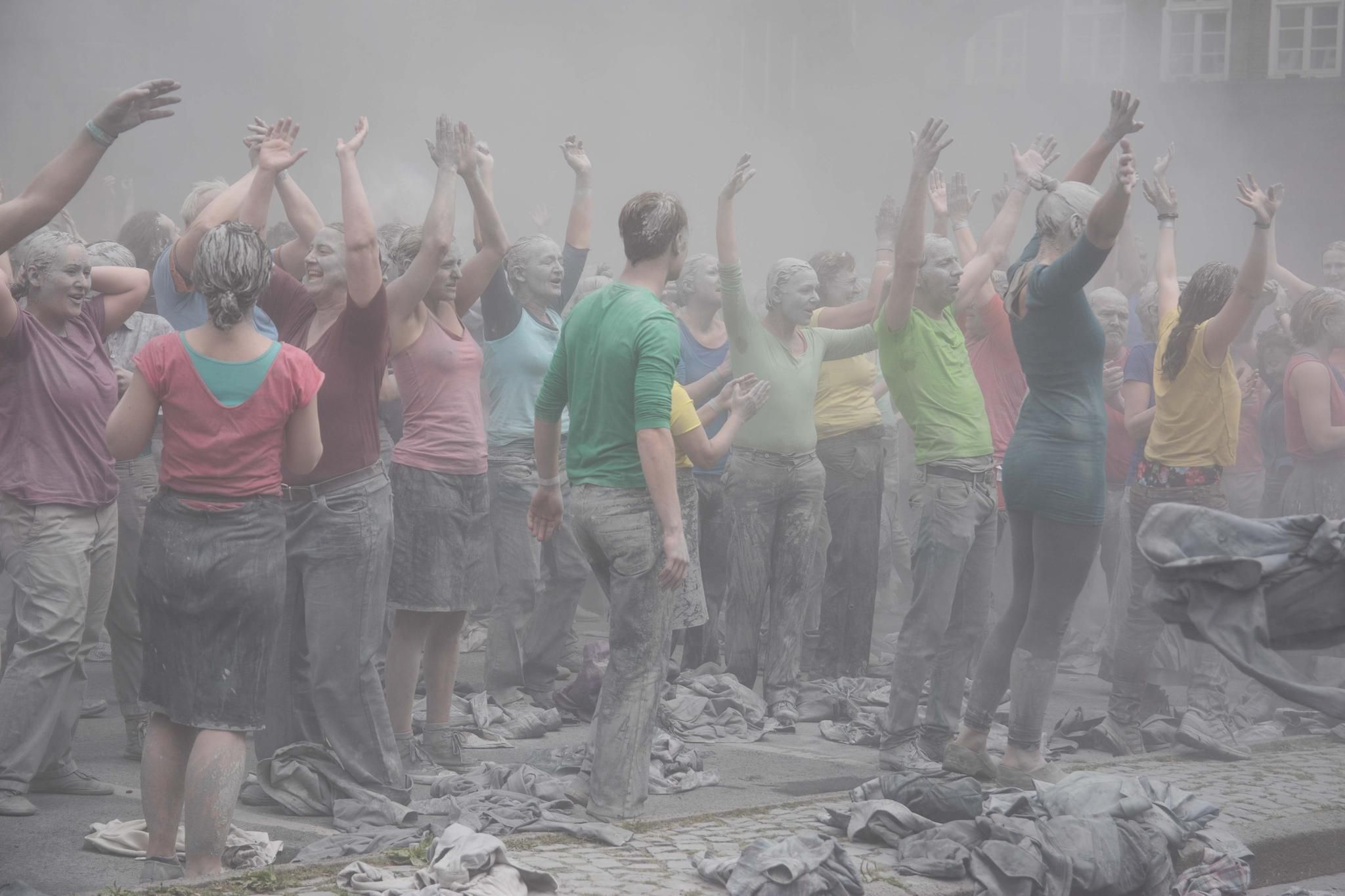 Staub liegt in der Luft. Sehr feiner Nebel, der wie eine zarte Wolke über dem Gelände am Oberhafen schwebt. Das Areal hinter den Hamburger Deichtorhallen hat am heutigen Vormittag einen künstlerischen Verwendungszweck erhalten: Es dient als Umkleide-, Probe- und Schminkstation für die anstehende G20-Performance "1000 Gestalten". Und die "Schminke" ist es, die in kleinen Teilchen in der Luft hängenbleibt, denn bei dem Make-up handelt es sich um "weißes Tonpulver, das mit Wasser und Pigmenten angerührt wurde", erzählt Rita Kohel, eine der Organisatorinnen der Veranstaltung. Auf dem Gelände sprechen zwar alle von Lehm, aber das stimmt eben nicht so ganz.