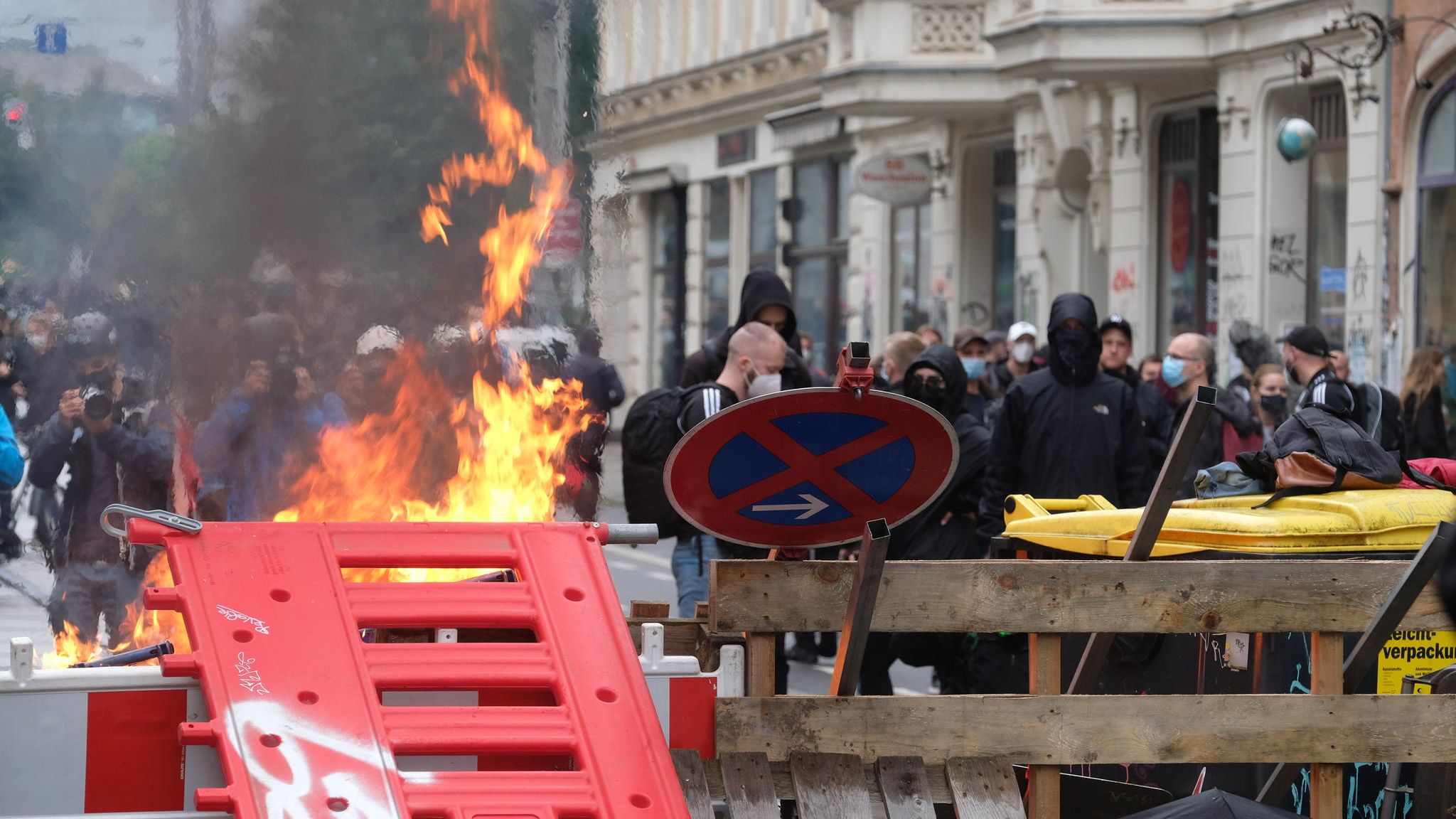 Die Demonstration begann zunächst friedlich, auch wenn immer wieder Böller und Bengalos gezündet wurden. Als der Zug die Polizeidirektion Leipzig passierte, wurden Flaschen und Feuerwerkskörper gegen das Gebäude geworfen. Entlang der Demo-Route sammelten einzelne schwarz Vermummte immer wieder Pflastersteine auf und schleuderten sie gegen die Scheiben mehrerer Bankgebäude; auch ein Haus mit Studentenappartements war Ziel.