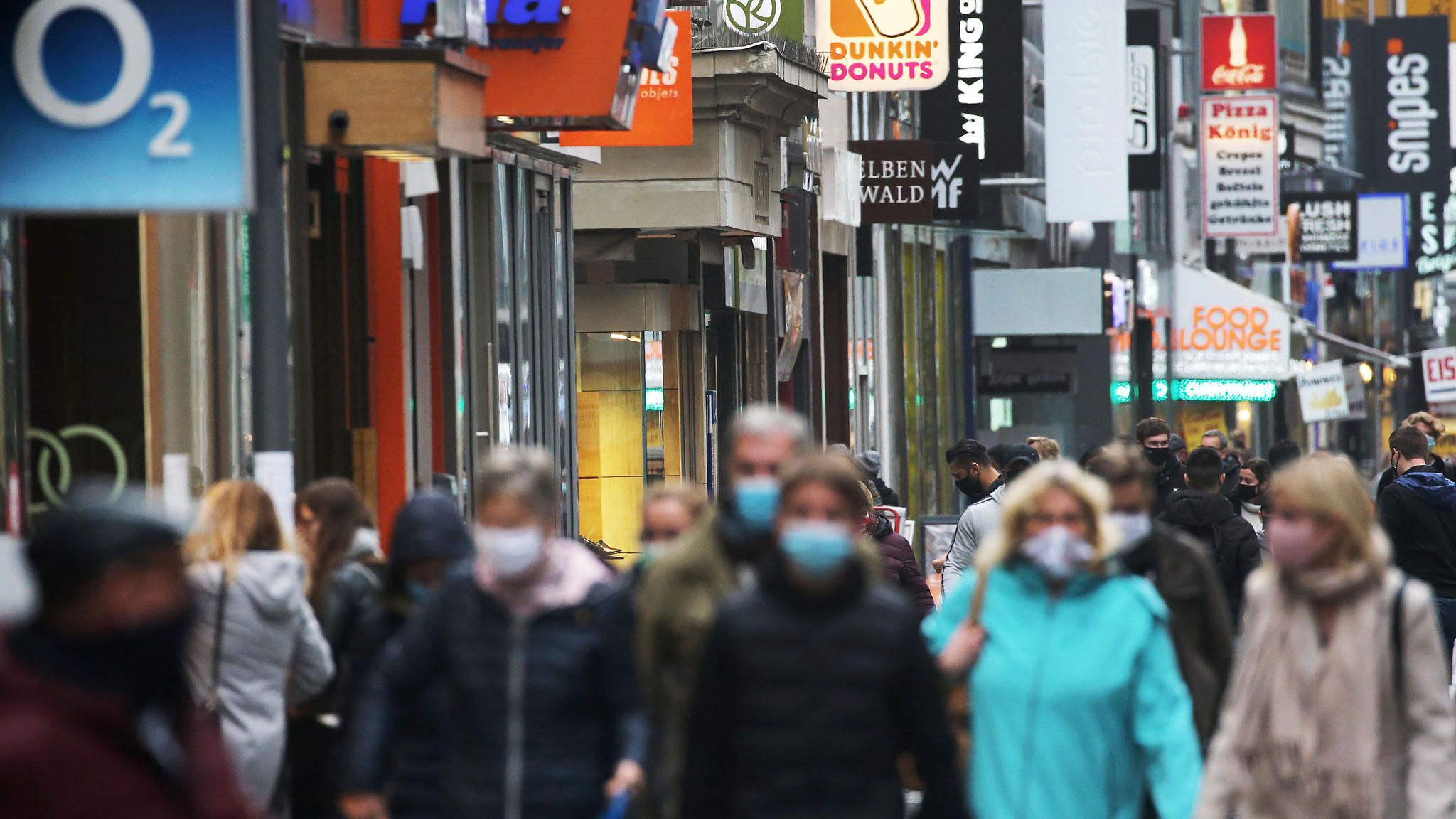 Nordrhein-Westfalen, Köln: Menschen gehen mit Schutzmasken durch die Fußgängerzone