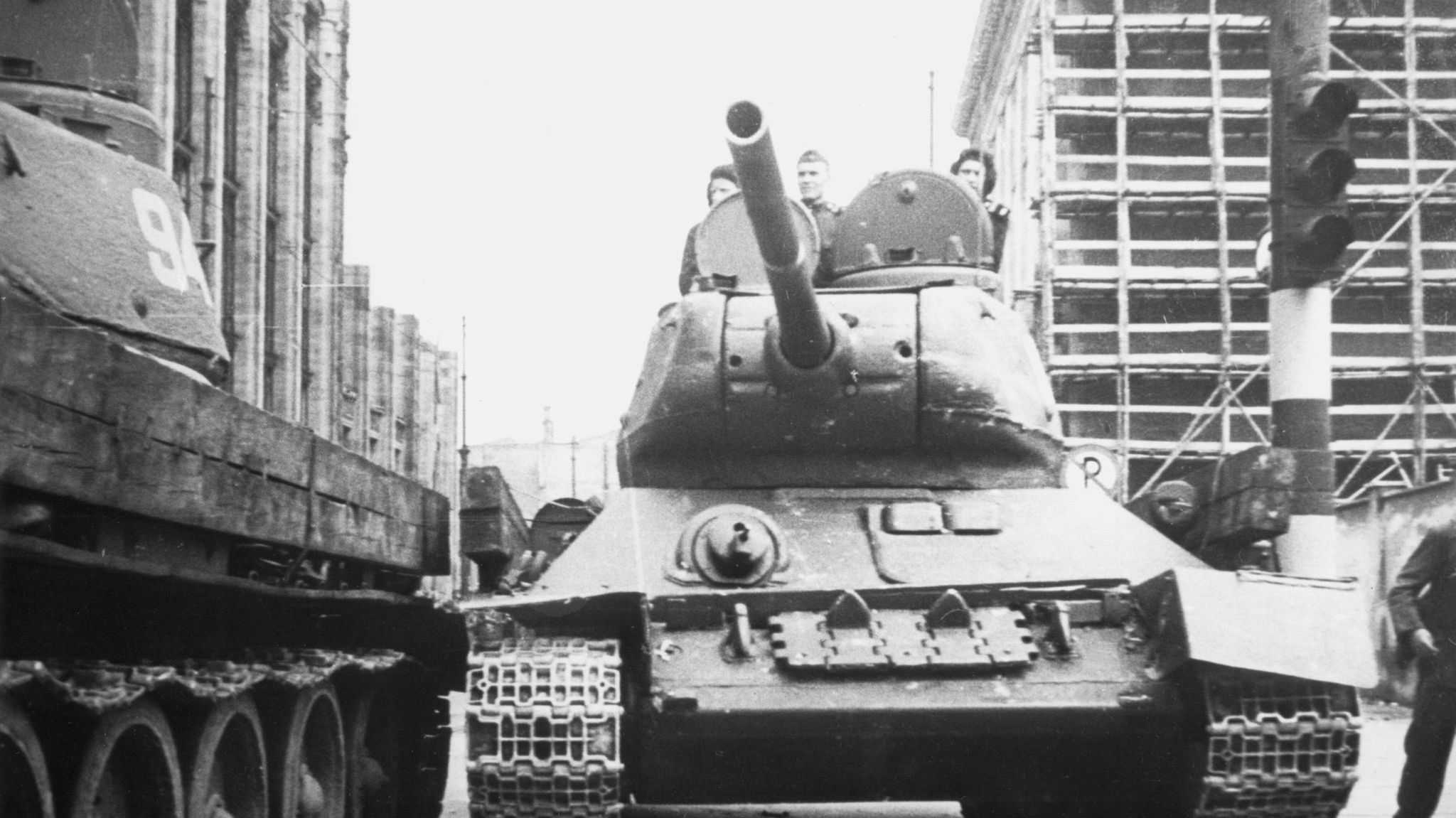 Nein. Am Ende der Straße steht ein T-34, ein sowjetischer Panzer. Der schwenkt das Kanonenrohr über die Kipper, und ein Offizier kommt aus der Luke hoch und brüllt: Dawaitje! Haut ab!
