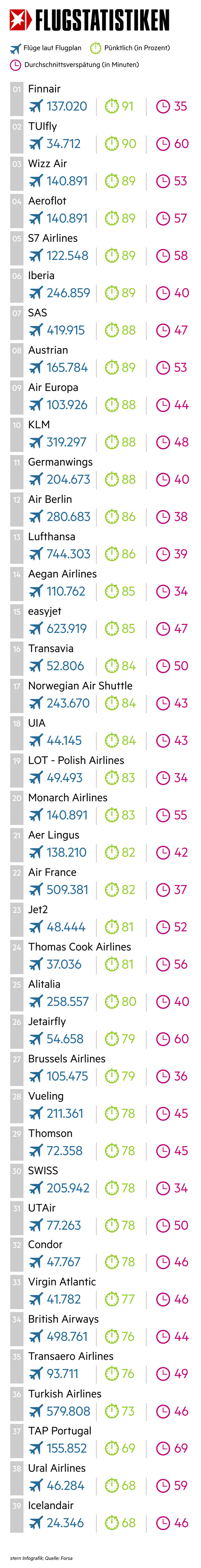 Als pünktlich gilt ein Flug, wenn zwischen einem geplanten Start oder der Landung und dem tatsächlichen Verlassen oder der Ankunft am Gate die Differenz zu den im Flugplan ausgewiesenen Zeiten nicht mehr als 15 Minuten betragen.