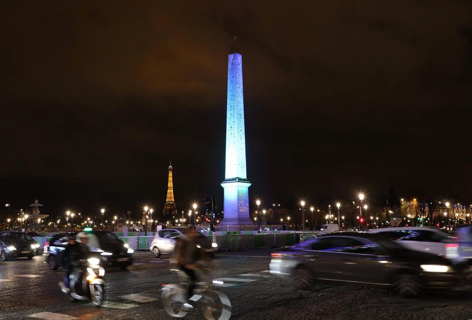 Der 23,50 Meter hohe Monolith auf der Place de la Concorde ist Teil der größten Sonnenuhr der Welt, ebenso die bronzefarbenen Linien und römischen Zahlen auf den Bürgersteigen