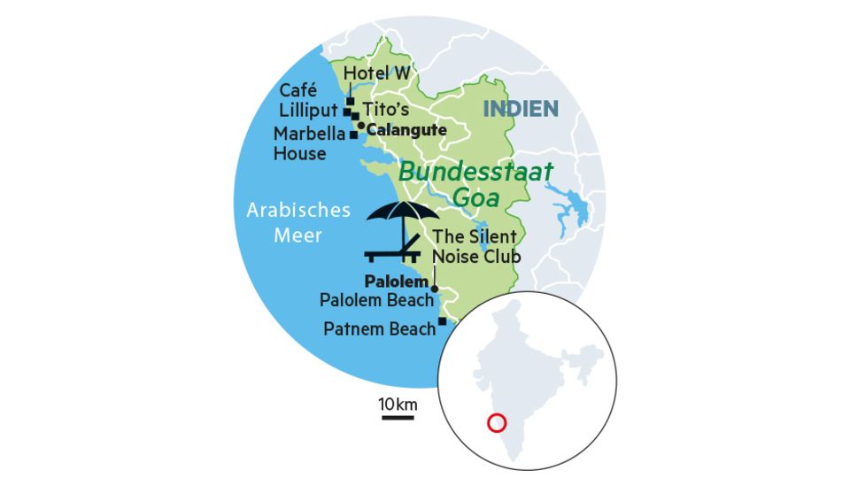 Die Strände sind noch immer die größte Attraktion. Kilometerlang, voller Palmen, eingerahmt von Felsformationen, die bis ins Meer ragen. Auch Jahrzehnte nachdem sich die ersten europäischen Hippies hier dem Glitzern des Meeres in der Nachmittagssonne hingaben, dem Rauschen der Wellen, dem Klang einer indischen Sitar oder dem Nebel ihrer Joints, sind Goas Strände das größte Kapital des kleinsten indischen Bundesstaates. Längst sitzen auch hier Rettungsschwimmer auf Hochsitzen, um mit Flaggen je nach Wind und Welle vor dem Baden zu warnen. Und in der Saison haben die Vermieter von Strandhütten ihre Liegen und die Besitzer von Cafés ihre Stühle und Tische in den weißen Sand gestellt. Doch ein paar Eigenheiten sind geblieben, wie sie immer waren.