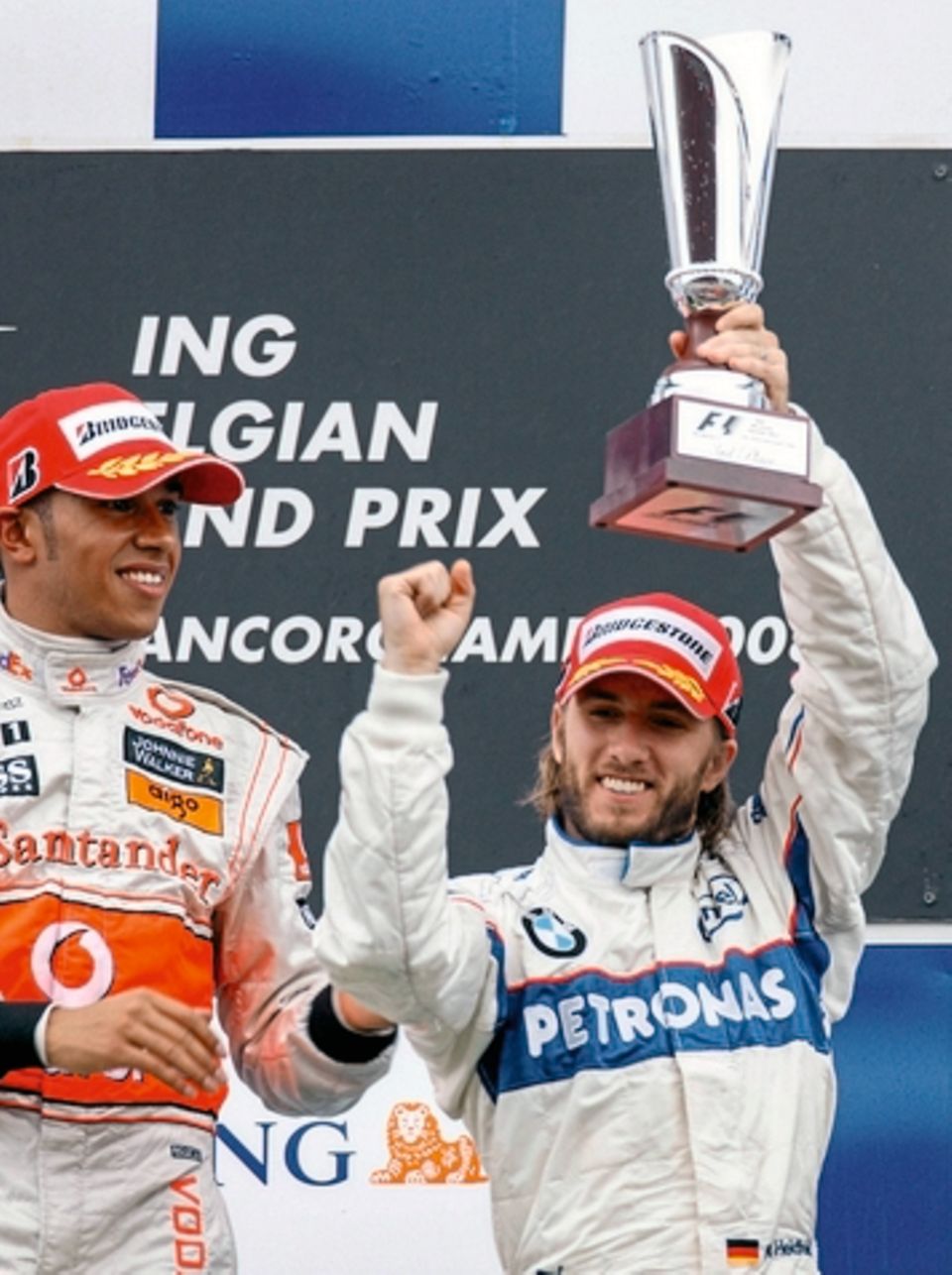 Heidfeld, 1977 in Mönchengladbach geboren, begann seine Rennsportkarriere mit fünf Jahren bei einem Motocross-Rennen. Nach einem Unfall wechselte er zum Kartfahren, wo er schnell den Spitznamen "Quick Nick" bekam und unter anderem gegen Michael und Ralf Schumacher antrat. Während seiner Zeit in der Formel 1 kam er 13-mal auf das Podium (Foto: als Dritter beim Grand Prix von Belgien 2008 neben Lewis Hamilton). Später fuhr er für das Team Mahindra Racing in der Formel E. Mit seiner Lebensgefährtin Patricia hat er drei Kinder.