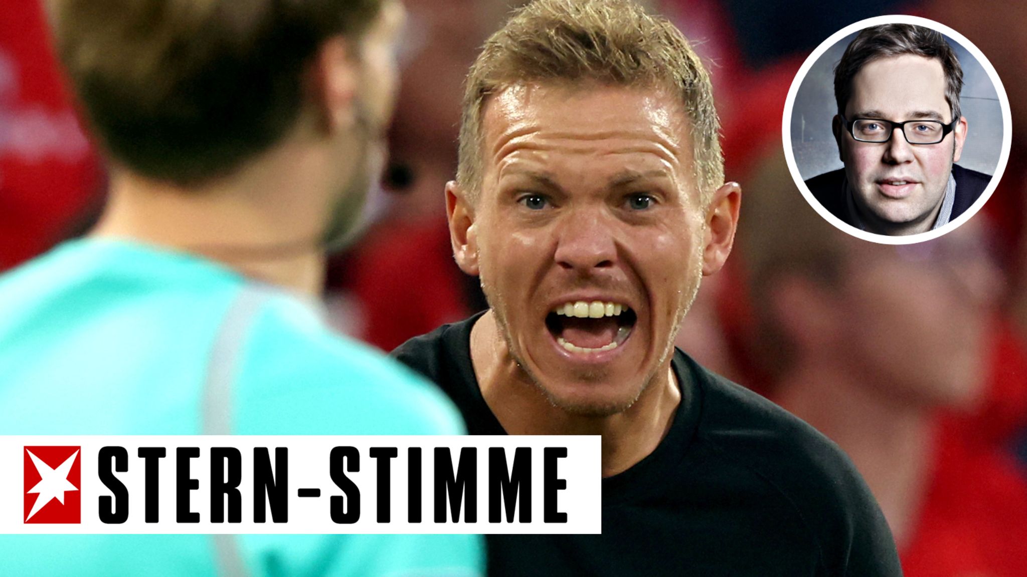 Und damit nicht genug der Verunsicherung, die der unerwartete Punktverlust bei den Bayern ausgelöst hatte. So wollte sich Bayern-Coach Julian Nagelsmann nicht am temporeichen und unterhaltsamen Spiel erfreuen, stattdessen nutzte er die Interviews nach dem Spiel für eine Generalabrechnung sowohl mit dem Schiedsrichterquartett, als auch dem Gegner, der ja nur "auf 10 mal 10 Meter verteidigt" habe und so nicht dazu beitrage, die Bundesliga attraktiver zu machen.